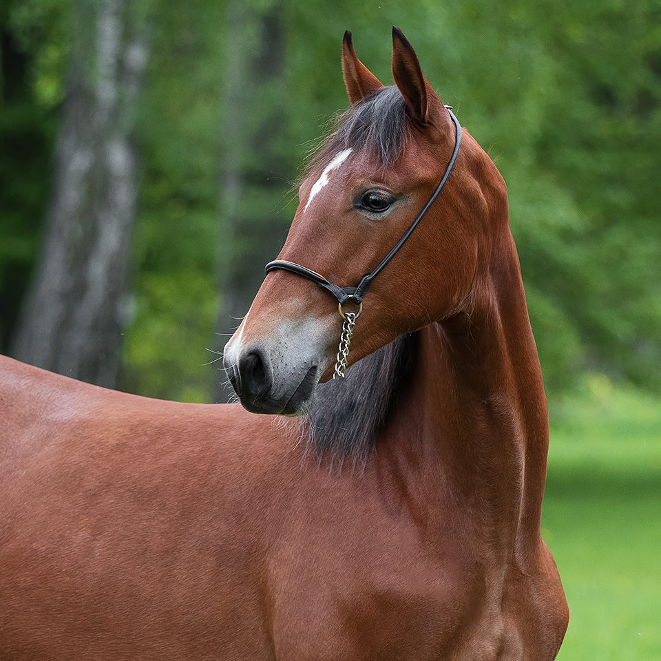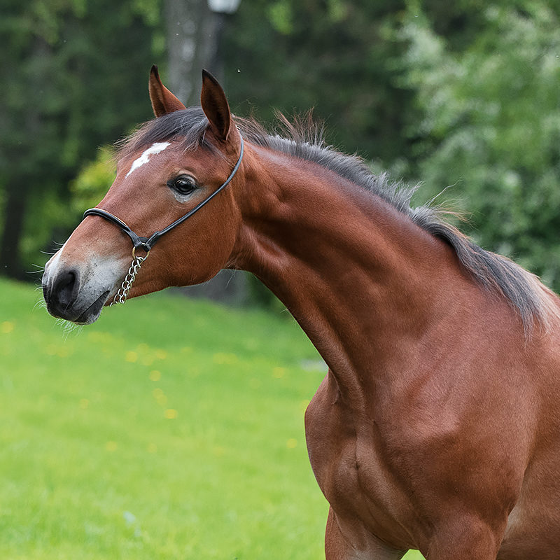 A lovely girl with a bright bay color, Bakardia was born rather late (April), but is already developing well and has excellent movement. She is well put together, with correct shoulders, clean legs, with a good, high-placed neck and well let-down croup that allow her to work strongly and regularly from behind. This is a very good, calm filly, and could adapt to universal use.