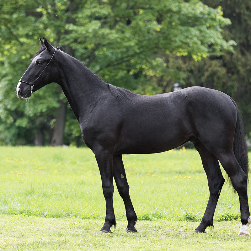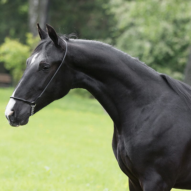 Bhutan has magnificent movement, working excellently through in his shoulders and strong, flexible hind legs for lots of impulsion and a ground-covering trot. He’s got it all: fine and correct conformation, good top-line, well placed neck, a very gracious head and expressive eyes, reminding us of his superb sire, and a gorgeous coal black coat! His good character is what we have come to expect from his breed, and in addition to being a nice fellow, he is very intelligent.