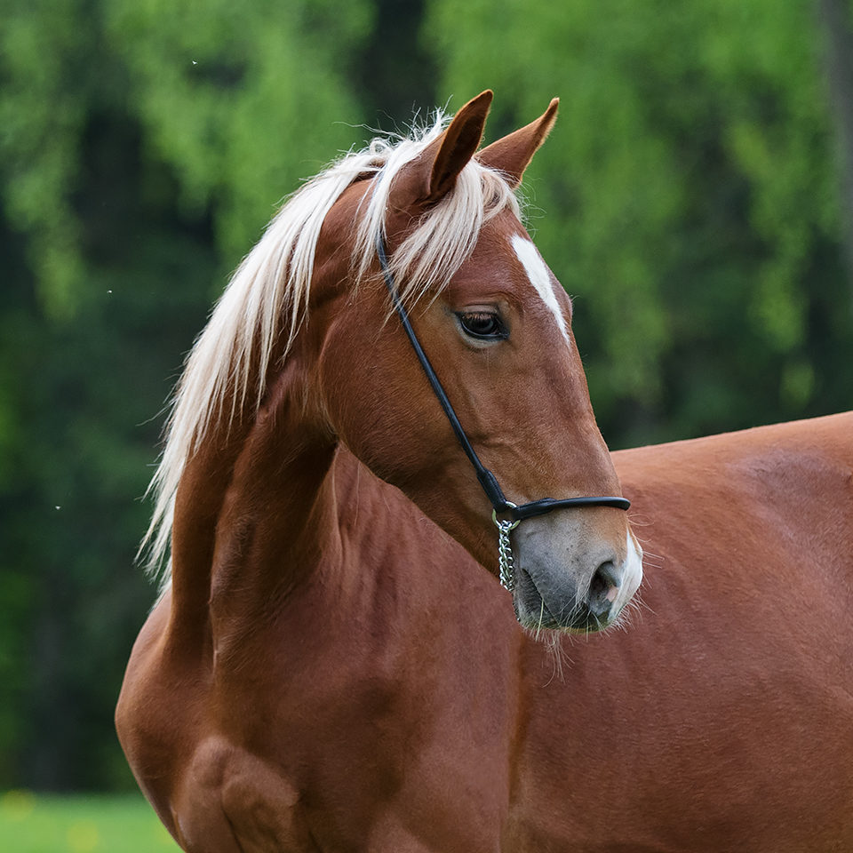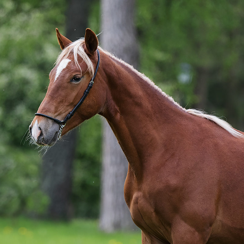 This bright and beautiful colt with the unusual and striking chestnut coat, has a breedy, slightly “arabian” head and expressive eyes.  He is square in body type, with long legs that are clean and correctly placed.  He is a sensitive, emotional and kind colt.