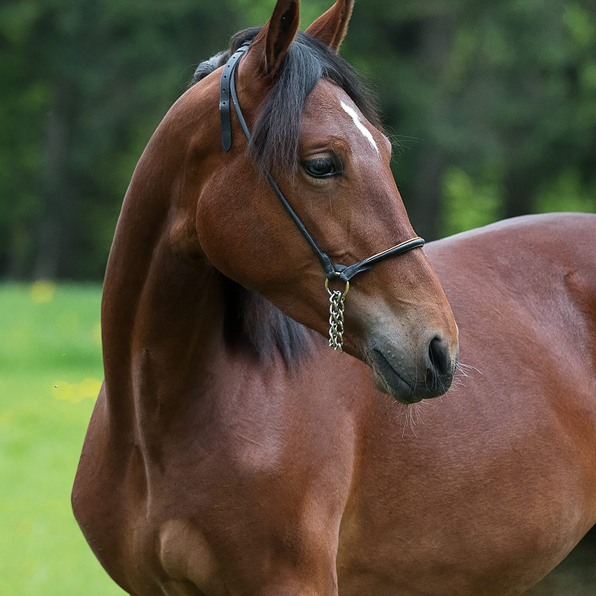 Here is another Kuplet filly, Persiyanka, with the elegant, breedy head of her sire. Like him, she has the correct, long clean legs and light movement that promise speed and distance. She is a bright, emotional filly, and could be a fine broodmare.